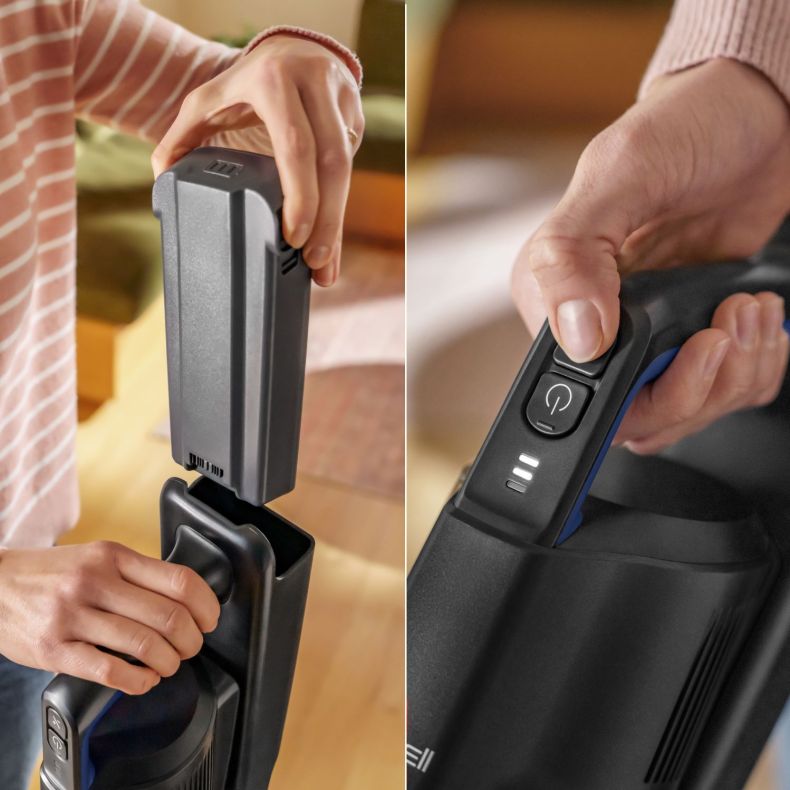 AUTOPORTANTE E A SGANCIO RAPIDO: appoggia il tuo aspirapolvere ovunque senza preoccuparti di cadute o danni. Basta premere una volta per sganciare il bastone estensibile.